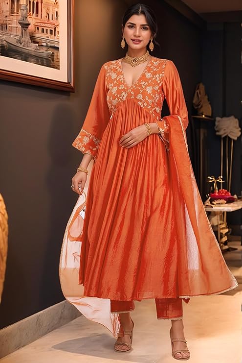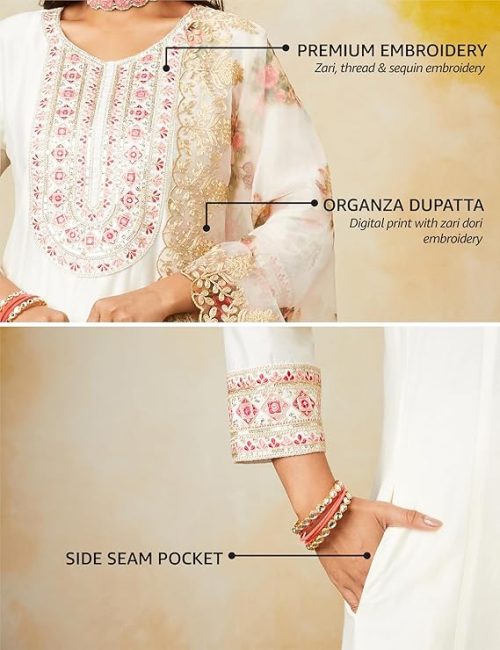 Off White Embroidered Anarkali Kurta Pant Set with Organza Dupatta
