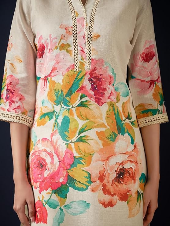 Top Pattern: Printed (Floral): The linen kurta features a printed floral pattern. Floral prints are a cornerstone of Biba’s design language, drawing inspiration from India’s rich botanical heritage and traditional motifs.