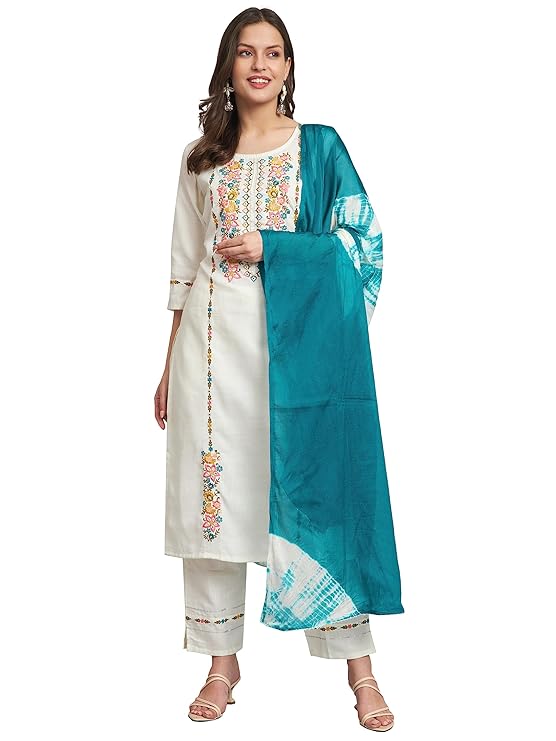 Cotton Blend Embroidered Fabric Kurta Pant Set With Dupatta