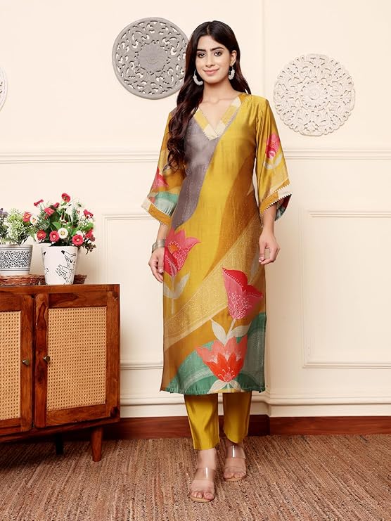 • The Cultural Resonance: The inclusion of gota is a direct nod to India’s rich artisanal history. It transforms the kurta from a simple printed garment into something special, a piece that carries a whisper of royal grandeur and handicraft heritage. It is the “traditional” counterpoint to the “contemporary” abstract print, embodying the promised fusionlady suit set.