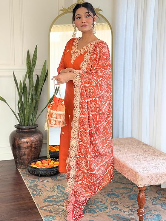 - Package Contains:- 1 Set : KURTA, PANT AND DUPATTA orange