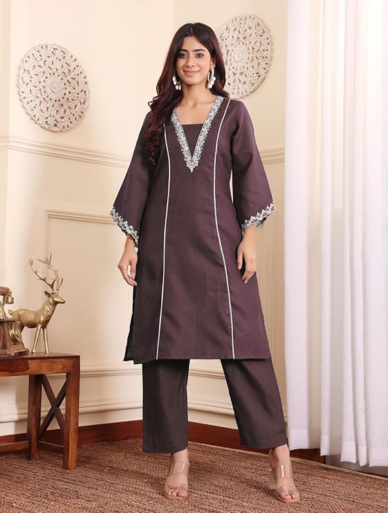 Content – 1 Kurta, 1 Trouser Kurta: Fit-Straight Fit Color – Wine Print & Pattern- Floral Zari & Sequin Embroiery On Neck & Sleeve Neckline – V NECK Sleeves -Bell Sleeve Length:- CALF length Trouser : Length – Ankle Length Pattern- Solid Fit – Regular Fit Waist- Elasticated Elevate your festive wardrobe with this trendy V-neck kurta set, designed to blend elegance with modern charm. Featuring a flattering V-neckline, this stylish ensemble is adorned with intricate detailing, making it perfect for festive celebrations, weddings, and special occasions. Crafted from premium fabric, the kurta offers a comfortable yet sophisticated fit, while the matching bottoms and dupatta complete the look effortlessly. Pair it with statement earrings and traditional footwear for a chic, festive-ready appearance that exudes grace and style.