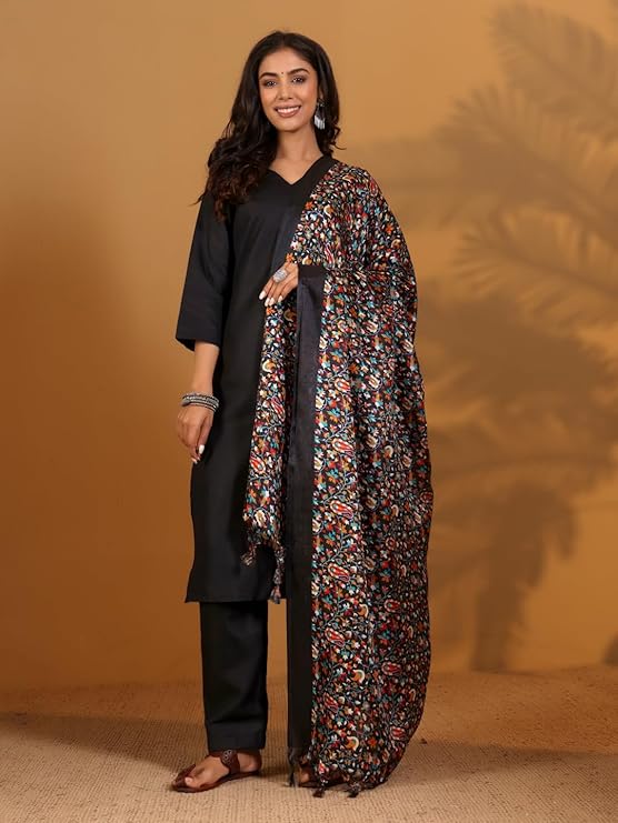 inherently chic. A black silk suit womens outfit serves as the perfect neutral canvas, allowing for incredible versatility in styling. It provides a dramatic backdrop that makes the colors and intricacies of the Kalamkari dupatta truly pop.