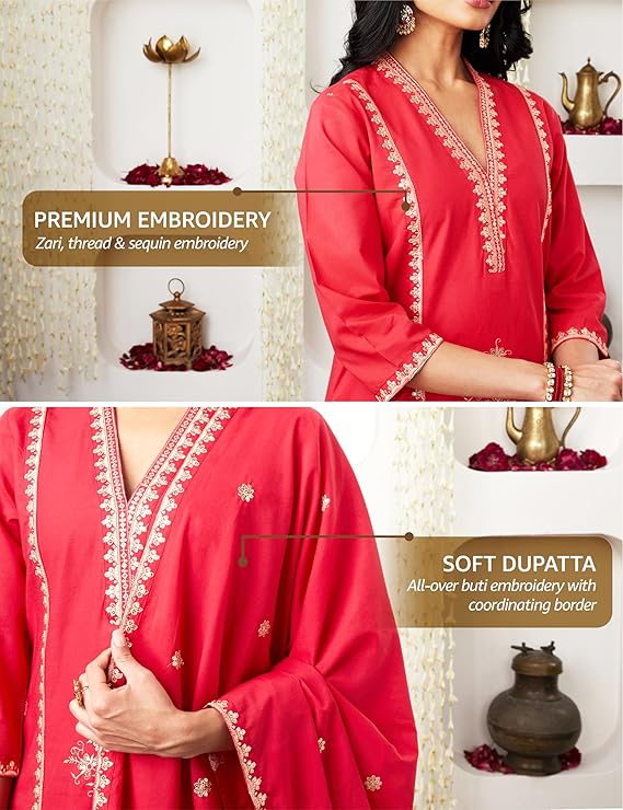 red Women’s Embroidered Cotton Kurta Pant Set with Dupatta