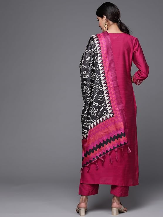 Women’s Silk Blend Embroidered A-Line Kurta and Pant with Dupatta Set
